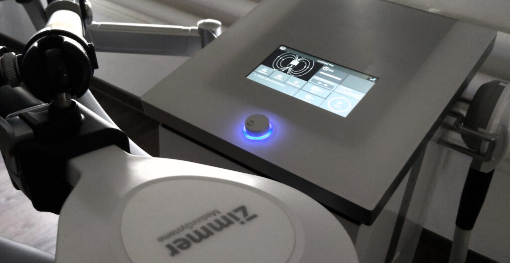 Die Therapie erfolgt mit einem mobilen Stoßwellen-Therapiesystem mit elektromagnetischem Antrieb. Der integrierte Stoßwellengenerator beschleunigt das Projektil im Handstück und erzeugt so mechanische Druckwellen, die über einen Applikatorkopf ins Gewebe des Patienten übertragen werden und sich dort radial ausbreiten. Die Behandlung reduziert Schmerz sofort und anhaltend, steigert die Beweglichkeit und aktiviert Heilungsprozesse. Dank der innovativen und einzigartigen Softshot-Technologie erzeugt das kompakte Hightech-Gerät sanfter und flacher ansteigende Druckwellen. Die sich für den Patienten wesentlich angenehmer anfühlen als herkömmliche Geräte mit Druckluft [Quelle: Zimmer Medizintechnik].